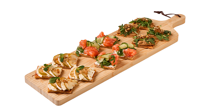 Состав: – Груша, камамбер, мед 4 шт. – Паштет куриный с вареньем и фисташкой 4 шт. – Лосось, крем чиз, руккола, огурец 4 шт.