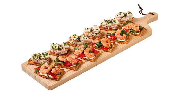 Состав: – Креветка, руккола, томаты, рикотта 6 шт. – Форшмак с яблоком и луком фри 6 шт.